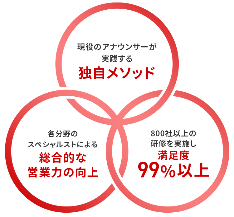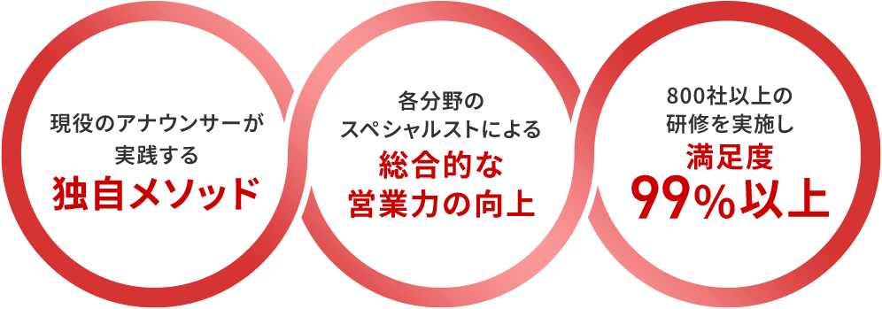「話し方」「営業コンサルタント」「脳科学」の3分野のプロによる研修を実施し、営業の商談から提案までに必要とされるスキルを多角的な研修によって向上させます。